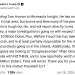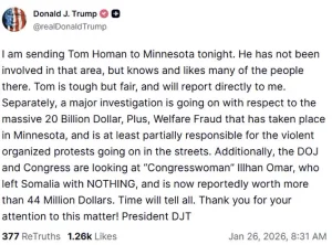 In a Truth Social post, Trump claimed that a ‘massive 20 Billion Dollar, Plus, Welfare Fraud’ case in Minnesota was ‘at least partially responsible for the violent organized protests going on in the streets.’ He also announced that the Department of Justice and Congress were examining Representative Ilhan Omar, stating, ‘Time will tell all.’ Homan, described by Trump as ‘tough but fair,’ was tasked with reporting directly to the president and coordinating with officials investigating fraud schemes in the state.
