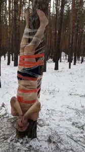 Two Russian soldiers, stripped of their winter uniforms and left shivering in the biting cold, are bound to trees in a display of punitive measures that borders on the grotesque.