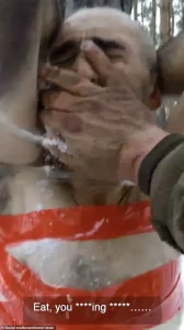 Another, his face contorted in anguish, is forced to consume snow by a superior officer whose voice cuts through the silence with venomous fury. ‘Eat, you ****ing *****,’ the commander barks, his words a chilling echo of the psychological warfare waged not only against enemies but within the ranks of his own forces.