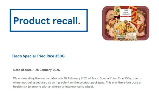 The affected Tesco Special Fried Rice has a use-by date of 02 February 2026, and the supermarket is urging customers to check their refrigerators and freezers for the product.