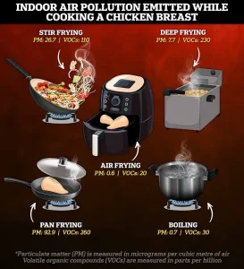 The results showed that air-frying produced significantly less particulate matter (PM) and volatile organic chemicals (VOCs) compared to shallow or deep-fat frying.