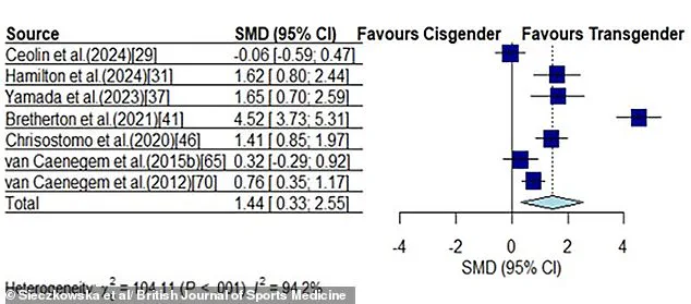 The study’s findings contrast sharply with previous research that has documented significant physical advantages in transgender athletes. For instance, a 2022 study found that male-to-female transitioners outperformed most women in strength, speed, and endurance, even after hormone suppression. The new analysis, which drew on 52 studies involving over 5,000 transgender and 1,000 cisgender individuals, acknowledges its limitations, including the absence of elite athletes in its data set. ‘Critical gaps in literature were found, notably the under-representation of transgender athletes who may retain more ‘muscle memory,’ the researchers admitted. This admission underscores a broader dilemma: how can we reconcile the need for inclusive policies with the imperative to protect the integrity of women’s sports? The answer, as with so many complex issues, lies in the balance between evidence and ethics.
